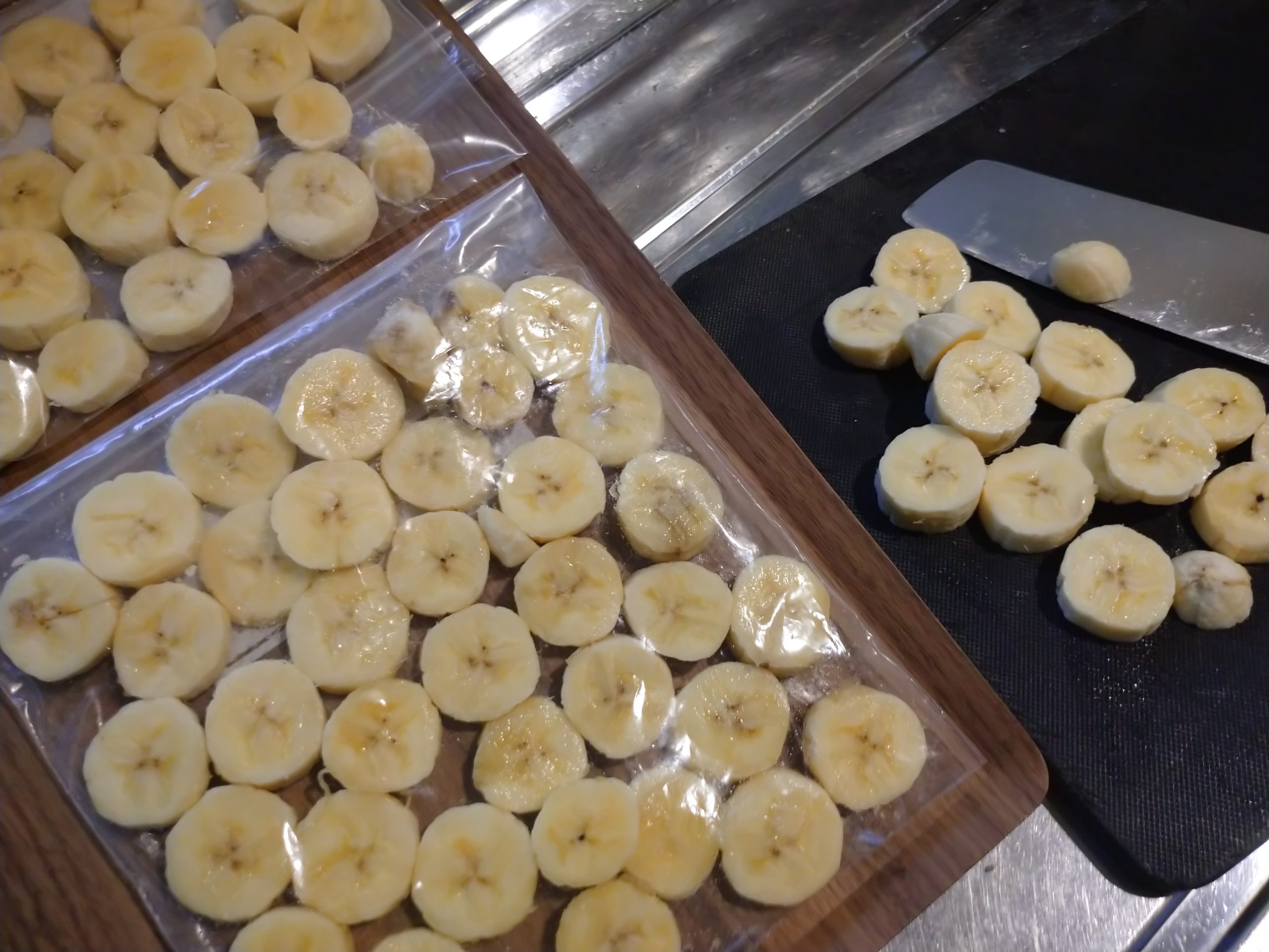 バナナを買ってその辺に置いておくと秒殺で子どもたちに食べられてしますので、今日使わない分は、カットして冷凍庫へ。保存バッグはもちろん再利用です。