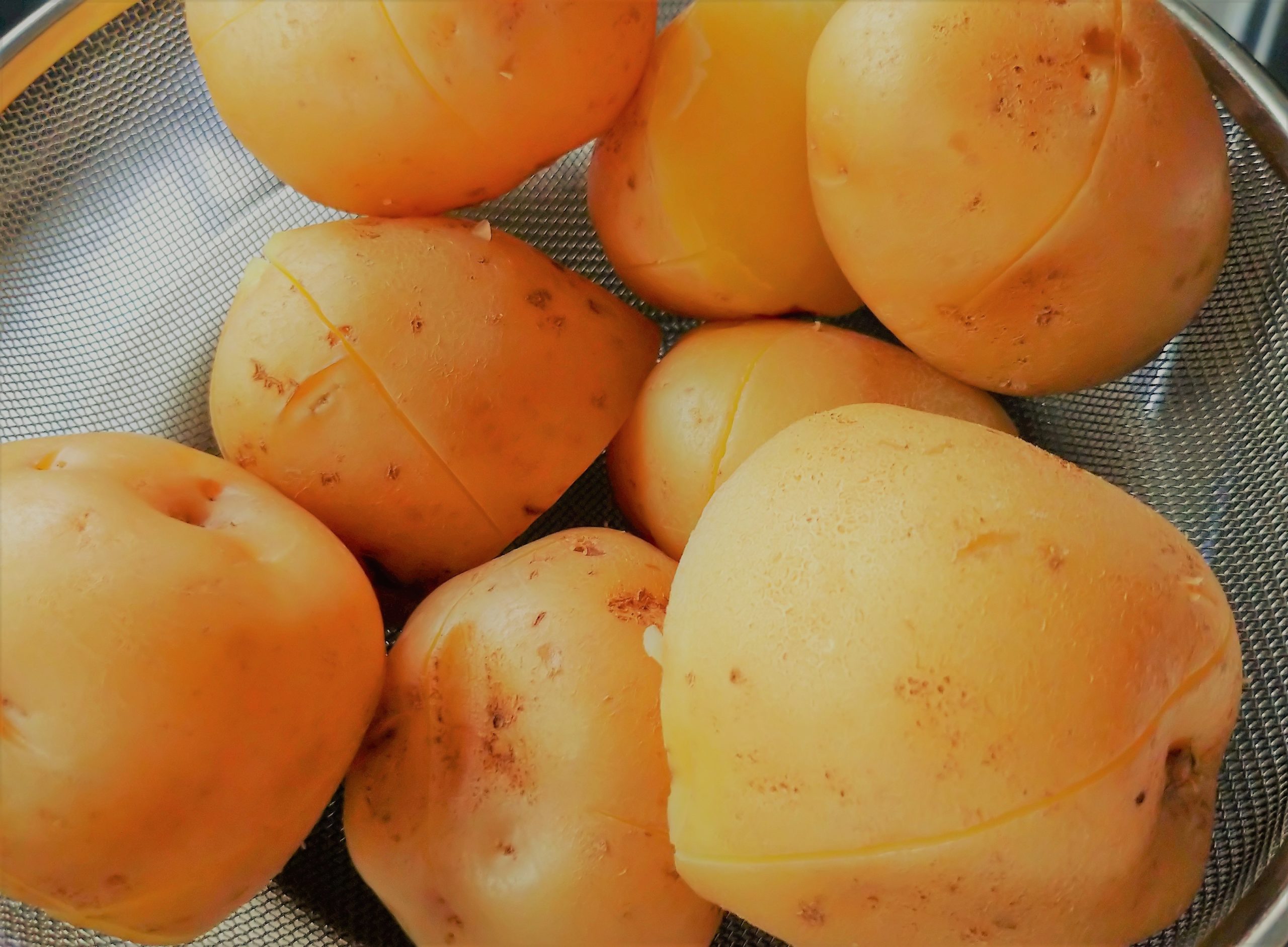 じゃがいもは皮に切れ目をつけて、まとめて茹でます。