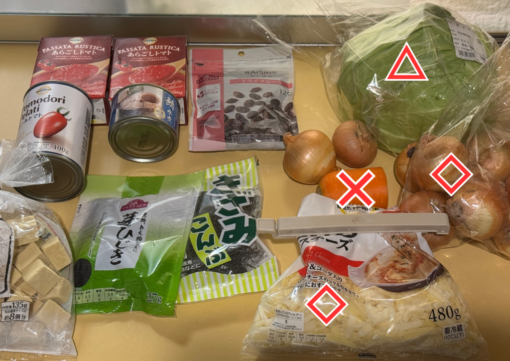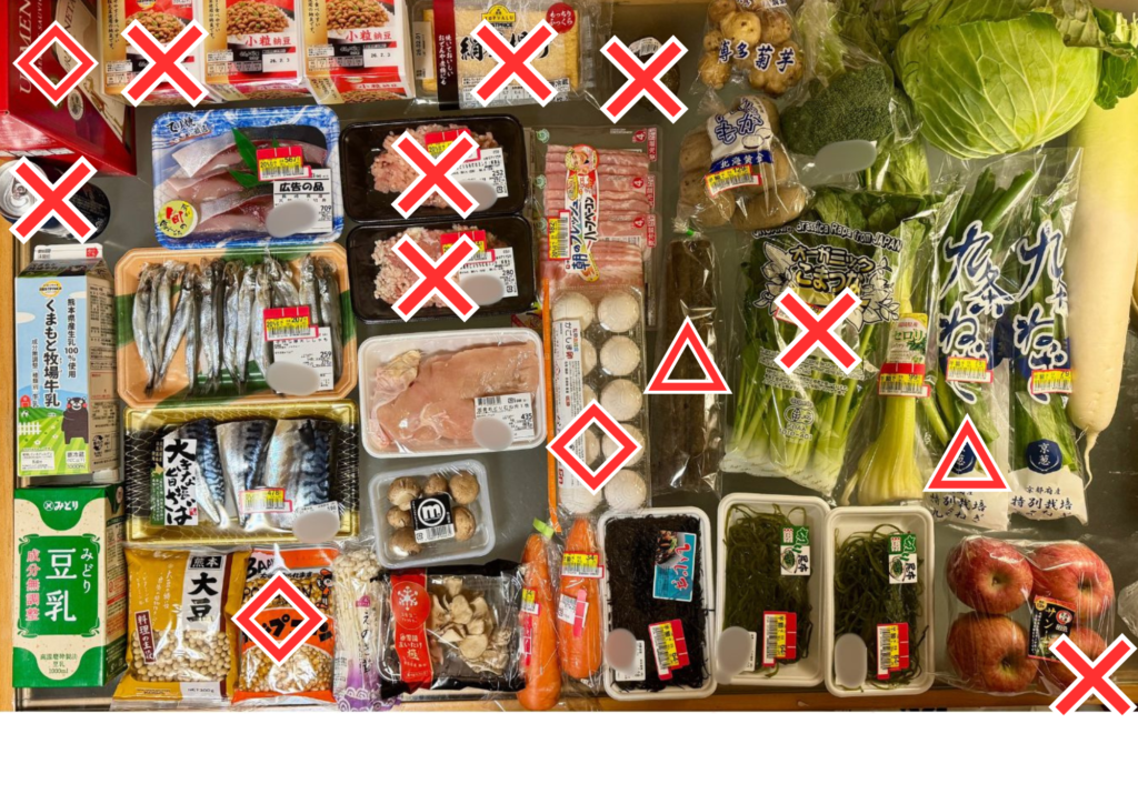 ×◇△がついているのは、今週、買い物に行ってからすでに消費している食材です。