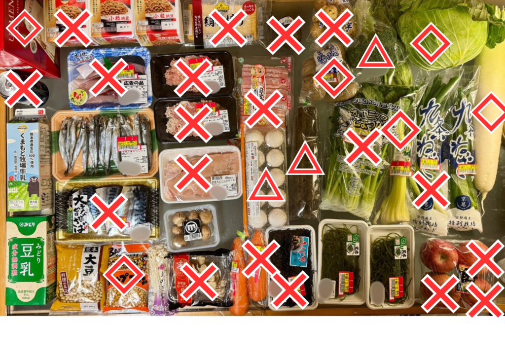 ×◇△がついているのは、今週、買い物に行ってからすでに消費している食材です。