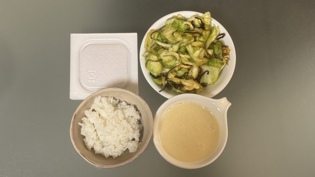 - 残り物(キャベツの塩昆布和え、大豆のスープ)