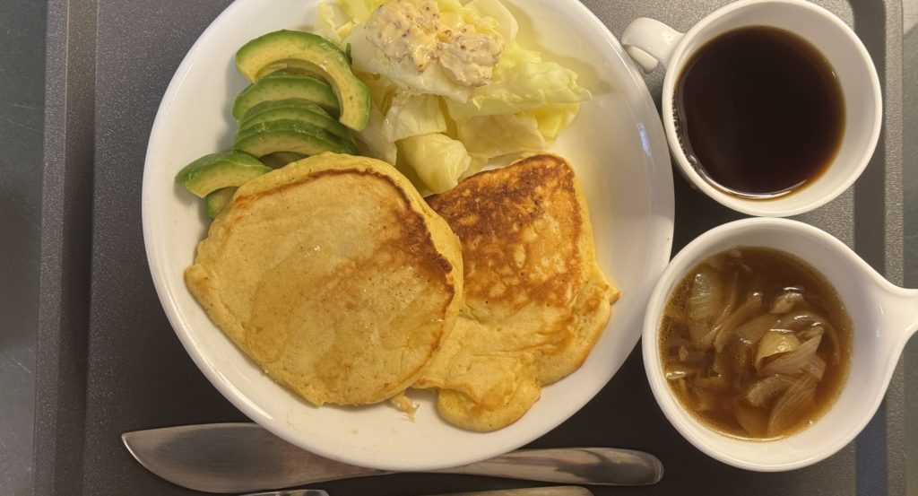 食材がまだ残っていたので、買い物は明日に伸ばして、翌日の朝ごはんは土曜日らしくパンケーキにしました。せっかくの週末なので、ちょっとだけ手間をかけてオニオンスープも添えてみると、朝の食卓がぐっと華やかに。